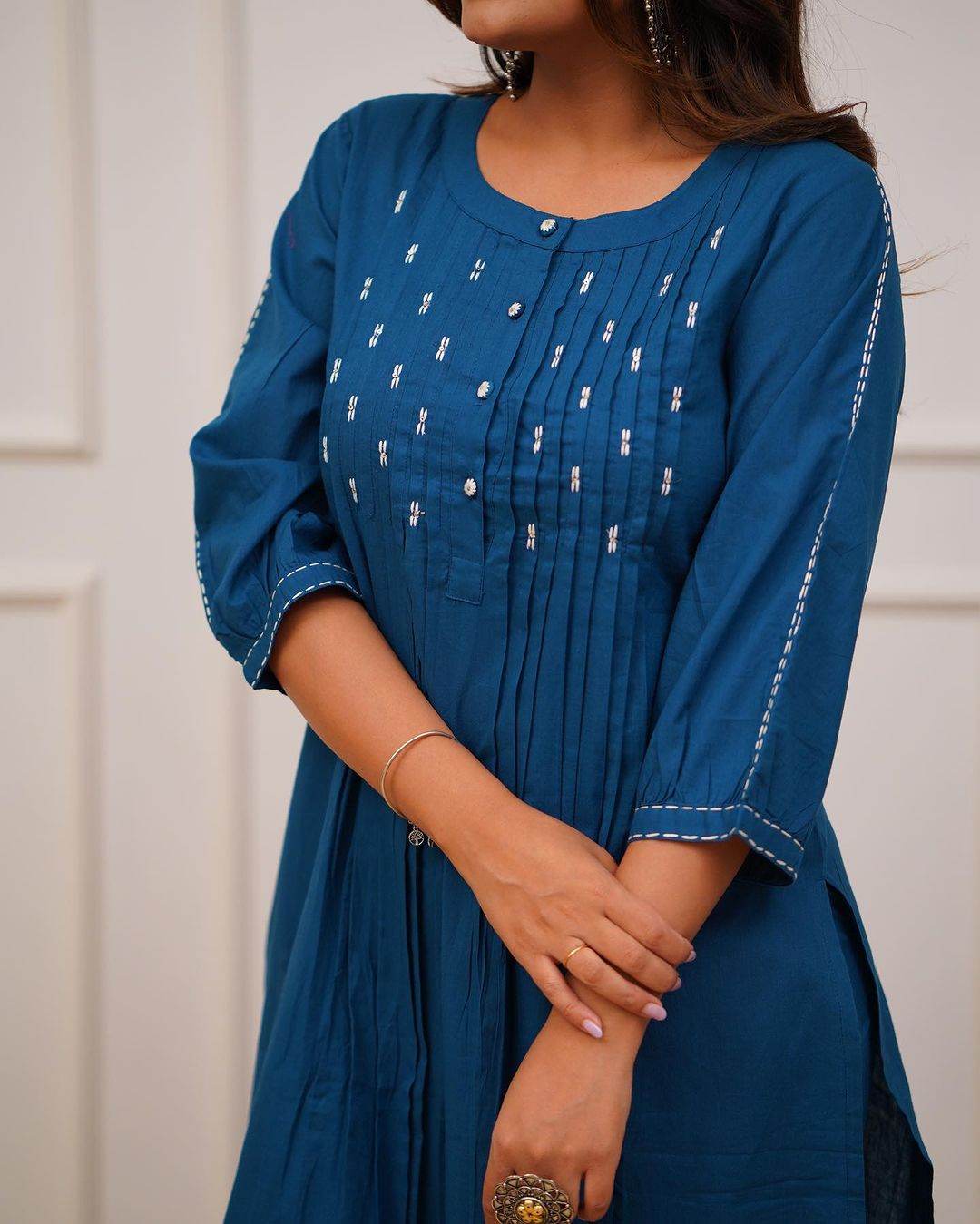 Upgrade your office wear wardrobe with this classy *teal blue kurti pant with beautiful manual tagai & button work detailing for all day comfort and trendy look